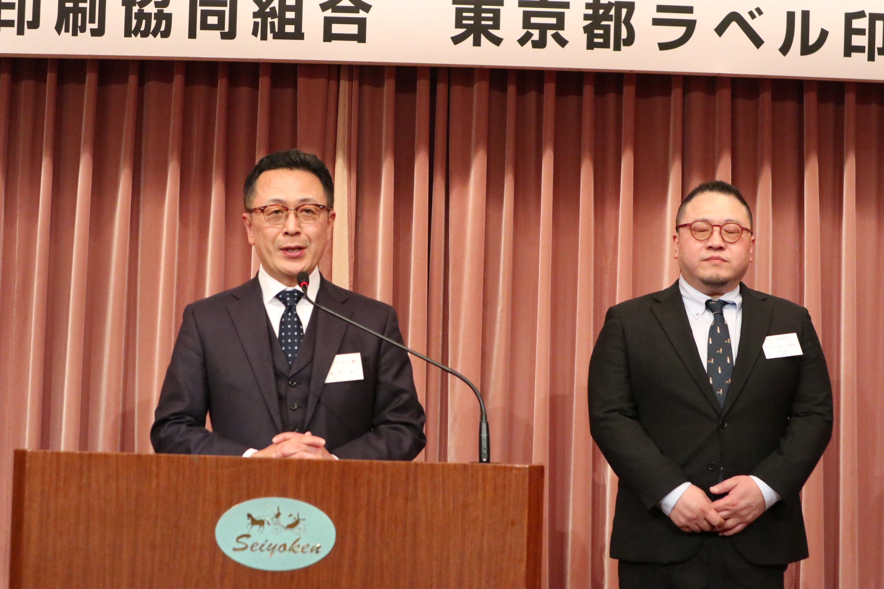 本年は当組合担当ということで、城 篤史理事((有)カムシーリング)の司会・進行で、ご来賓の紹介に続いて、田中理事長が挨拶(別項)、東京都中小企業団体中央会の石田靖博参事、東京シール・ラベル印刷協賛会の服部真会長の両来賓が祝辞を述べました。